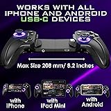 🏆 MOBILE GAMING: Transform your mobile device into a gaming console with the ELO Vagabond Hall Senso Mobile Gaming Controller. The perfect USB-C iPhone game controller is compatible with iPhone 15/16/17, iPad Mini, and Android phones up to 8.2 inches-even with a case-delivering a seamless, hassle-free setup for on-the-go gaming. 🏆 CONSOLE GAMING IN YOUR POCKET: Turn your USBC device into a gaming console – Choose games on any platform from Call of Duty Mobile, Genshin Impact or use remote play gaming services such as Playstation Remote Play, Xbox Remote Play, Steamlink, Shadow PC, Xbox Game Pass Or Emulators with the ultimate phone controller. 🏆 ULTRA-LOW LATENCY: Pro telescopic mobile gaming controller with hall sensor technology - Equipped with Hall Effect joysticks and triggers and ultra-low 1ms latency response time with 2 Programmable back buttons and pass-through charging making this the ultimate iPhone Game Controller and Android Game Controller 🏆 CUSTOMIZABLE APPLICATION: Powered by the ELO unleashed app – Launch games, customize controls, Play on any screen, Control your gaming library, and keep the your Vagabond phone controller updated with advanced features with the Unleashed App at the touch of a button 🏆 APPLE CERTIFIED: Ensure seamless compatibility with this MFI Certified mobile gaming controller – Officially certified as an Apple iphone game controller and iPad Mini game controller to ensure seamless compatibility and optimal performance with iPhone, iPad, and iOS devices ⚠️ Max Product size is 8.2 inches (208 mm). This will fit an iPad Mini but NOT compatible with a full-sized iPad or Full-Sized Tablet that is above 8.2 inches (208 mm) ⚠️ This product is USBC only. It works with all USBC devices that can fit inside of the device and is NOT compatible with lightning connector or older iPhone Models.