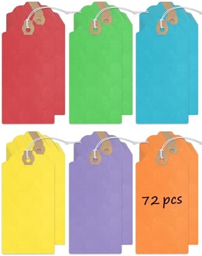 - Versatile Hanging Tags: A total of 72 blank labels in 6 colors and 12 labels for each color. Perfect for marking goods, clothes, jewelry, stationery, crafts, toys, luggage, etc. Great to be used as price tags, shipping tags, inventory tags and so on.