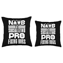 For all the Coders, Programmers, and Developers who love humorous coding, this design is perfect for you! Show your humor with this "Noob at socializing, Pro at fixing bugs" programming joke design. Perfect for any debuggers who loves coding humor. Embrace your inner noob with this funny anti social design. Great for developers who excel at fixing bugs but struggle with socializing. 100% spun-polyester fabric Double-sided print Filled with 100% polyester and sewn closed Individually cut and sewn by hand Spot clean/dry clean only