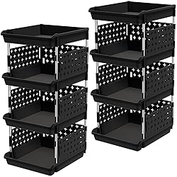 - Stackable Design: Customize your storage needs with our adjustable-tier stackable storage containers. Stack 4, 3, or 2 layers easily to fit your preferences. It maximizes space savings by utilizing vertical space and the top tray allows for unrestricted height usage, giving you even more storage options. Large Capacity: Each of our spacious stackable storage bins features four tiers, with each tray measuring 13.8" x 11.8" x 2.4". With a total size of 13.8" x 11.8" x 28.3", it can hold up to 80 pounds of items. The basket's open design makes it easy to view and retrieve items. Easy Assembly: Assembly is a breeze with our stacking storage bins, which comes with an easy-to-follow instruction manual. No tools are required, and it can be assembled in just a few minutes. Say goodbye to complicated assembly processes and hello to hassle-free organization with our storage baskets. Multi-Functional: Our stackable bins are versatile and convenient, making it suitable for storing a wide range of items, such as toys, clothes, snacks, vegetables, fruit, onion, potato, and more. It can be used in various settings, including bedrooms, storage rooms, kitchens, bathrooms, living rooms, offices, and other places. Durable & Sturdy: The storage bins for shelves are made of high-quality PP plastic and easy to clean with a damp cloth. The metal pole is made of waterproof and rust-proof stainless steel. These materials ensure durability and longevity, providing you with long-lasting storage solutions that can withstand daily wear and tear.