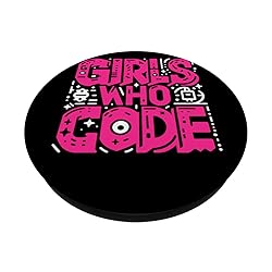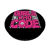 An illustration related to programming and the text "Girls who code" Available for Men and Women Adhesive backing attaches the PopGrip to your case or device. Will not stick to silicone, leather, waterproof, or highly textured cases. Works best with smooth, hard, plastic cases. Not compatible with wireless charging Printed top is swappable with other compatible PopGrip models. Just press flat, turn 90 degrees until you hear a click and remove to swap.