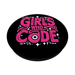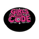 An illustration related to programming and the text "Girls who code" Available for Men and Women Adhesive backing attaches the PopGrip to your case or device. Will not stick to silicone, leather, waterproof, or highly textured cases. Works best with smooth, hard, plastic cases. Not compatible with wireless charging Printed top is swappable with other compatible PopGrip models. Just press flat, turn 90 degrees until you hear a click and remove to swap.