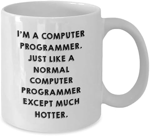 Are you a computer programmer or looking for a unique Christmas gift for someone who loves coding? Look no further! Our funny quote 'I'm A Computer Programmer. Just Like A Normal Computer Programmer Except Much Hotter.' on this white coffee mug is the perfect way to celebrate programming pride. Made from ceramic, this 11oz or 15oz coffee mug is microwave and dishwasher safe, making it easy to clean and maintain.This thoughtful gift is perfect for any programming enthusiast, whether it's for friends, family, or coworkers. Imagine the smile on their face when they receive a gift that shows you understand their love for code. It comes with lighthearted and humorous message, making it a great conversation starter. The recipient will appreciate the nod to their programming passion and the humor it brings to their daily routine.This coffee mug is not just a functional gift but also a thoughtful one. The sender will appreciate the attention to detail and the sentimental value it holds. The recipient will love the unique design and the reminder that they're a hot programmer. Whether you're a programmer yourself or just a fan, this gift is sure to bring a smile to their face.So why wait? Get this amazing coffee mug as a Christmas gift for someone who loves computer programming and show them you care about their programming pride. Don't miss out and make their Christmas a memorable one!