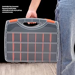 Excellent PVC Material: Constructed from rugged and heavy duty PVC material, the hardware tools organizer ensures long lasting use and storage for your tools and accessories. The well crafted design exudes a professional look, featuring a gray main body, transparent cover, orange lid, and dividers in striking color combinations. Multiple Compartments: With 21 adjustable compartments and two fixed sections on either side of the handle, this tools organizer container offers ample storage space for customization. The removable dividers slide in and out effortlessly, allowing you to tailor the storage space according to your specific needs. 2 Secure Latch Locks: Equipped with two secure latch locks, the hardware storage organizer can be smoothly opened and closed to prevent items from falling out during transport. The top handle makes it easy to carry the organizer wherever you go, ensuring portability and convenience. Easy Using: The fixed sections provide additional space to accommodate special items, ensuring that all your tools and parts are neatly organized and easily accessible. The transparent cover allows for a clear view of the contents, enabling quick and convenient identification of stored items. Wide Application: This versatile container is ideal for storing a wide range of small building materials, parts, fasteners, screws, nails, nuts, bolts, electrical connectors, accessories, beads, fishing tackle, and various other smaller items. The hardware organizer box offers a practical and efficient storage solution for organizing and transporting your tools and supplies with ease and efficiency.