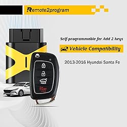 • **No Working Key? Need to program the key? **Our Kit uses state-of-the-art technology and is the first one on the market capable of programming smart keys. You just program it at home though you don't have one working remote, It can add 2 keys within 5-10 min, skip the locksmith and dealer, and get new key without paying expensive fees. Paired with keys to give you more peace of mind. Act quickly!!!!NOTE: 1. Before you buy it, Please make sure that your original FCC and Buttons are the same as our product in case of money lose. 2. Need to find dealer to buy a BLADE CODE and to cut the blade before programming. 3. All the remotes need to be reprogrammedThis remote is replacememnt for FCC ID: TQ8-RKE-3F04 IC: RKE-3F04 Frequency: 315 MhzCompatibility :For 2013-2016 Hyundai Santa FeDisclaimer: Remote2program device is only used by car owners to program their own vehicles, and other actions are not affiliated with Remote2program