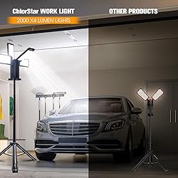 【Powerful Brightness with Stepless Dimming】 Featuring 4X 2000 lumens at maximum brightness, this LED work light offers stepless dimming to adjust to your desired brightness level. With 5 lighting modes—Warm, White, Warm White, Fast SOS, and Slow SOS—you’ll have the perfect lighting for any situation. Adjust brightness freely using the +/- buttons, and switch between modes with the “M” button. 【Upgraded Battery】Equipped with upgraded battery, this work light can operate for over 30 hours at the lowest brightness. [Attention] This work light uses a genuine upgraded battery, requiring over 8 hours to fully recharge when depleted. Please allow adequate charging time. 【Adjustable Rotating Light Panels】 Designed with 4 LED lighting Panels, ChlorStar work light ensures better coverage. Each panel can be adjusted vertically up to 180° and horizontally up to 270°, allowing you to illuminate any corner with ease. 【Multi-Stage Adjustable Foldable Stand】 Comes with a tripod stand featuring three height adjusters on the main pole, reaching up to 79 inches when fully extended. The stand is foldable for easy transport and storage and can be adjusted to multiple heights to meet your needs. The portable work light is detachable from the stand for standalone use, offering maximum convenience. 【IP66 Waterproof Design】 The housing and connection components of the light head are built with IP66 waterproof technology, ensuring durability in wet environments. This LED work light with stand resists aging and damage, making it ideal for challenging conditions.
