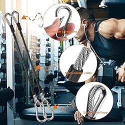 Dual Accessories for Enhanced Training Experience: You will receive 2 home gym extension cables and 2 carabiners. These extension cables are approximately 10 inches/25 cm long, and the carabiners are about 2.4 inches/6 cm long. Equipped with a 20mm eyelet hole, they perfectly match our 30mm gym-grade carabiner clips, with a recommendation to use one clip per extension cable for added stability and safety during your workouts. Durable and Reliable Materials: Our gym extension cables are crafted from stainless steel and PU materials, known for their wear resistance, solidity, durability, and long service life. The connection between the steel wire and the PU sleeve is reinforced with a nylon protective cover, ensuring that the PU sleeve is securely attached to the steel wire, providing you with a safe and dependable fitness experience. Multi-Angle Exercises for Comprehensive Development: These extension cables assist in developing your triceps, biceps, back, shoulders, abs, and grip strength, especially during high-pressure gym cable machine extensions. By extending the cables on your home gym equipment, you can achieve better angles on your functional trainer, doing more with less and enhancing the efficiency of your workouts. Easy to Use and Versatile: Simply attach our heavy-duty gym handle extension cables to most home gym exercises, such as latissimus dorsi pull-downs and triceps push-downs, as well as some leg movements. This cable is widely used in personal workouts, gymnasiums, and clubs, benefiting both beginners and professional sports enthusiasts, offering a variety of options for your fitness training. A Unique Fitness Experience: Professional cable machine replacement cable, easy to replace and install, different length specifications, match a variety of cable machine requirements. Upgrade your home gym experience with our gym machine accessories, making your workouts more efficient and enjoyable.