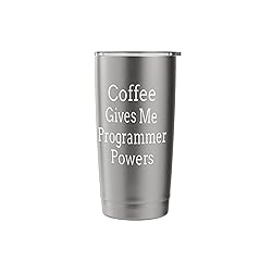 This funny Coffee Gives Me Programmer Powers design is perfect for the computer programmer, coder, or computer nerd who needs a little caffeine to get through the day. The perfect gift for the computer tech-savvy programmer coffee lover in your life. Show off your love for coding and coffee with this funny programmer design. Great for birthdays, holidays, or just because. Get one for yourself or the programmer in your life today! Dual wall insulated: keeps beverages hot or cold Stainless Steel, BPA Free Leak proof lid with clear slider