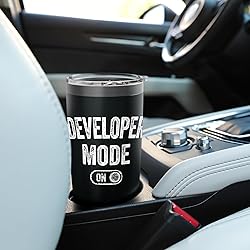 Funny code wizard gift idea for men, women - Developer Mode On. Complete set of developer costume accessories, stuff or decoration for him or her on coding sessions, tech conferences, hackathons, software releases Humor Developer Mode On Design - present for developer, programmer, software engineer, web designer, tech enthusiast, mom, dad, sister, brother, friend, colleague, project manager, fellow developer, it student, mentor, partner, client, startup founder Dual wall insulated: keeps beverages hot or cold Stainless Steel, BPA Free Leak proof lid with clear slider