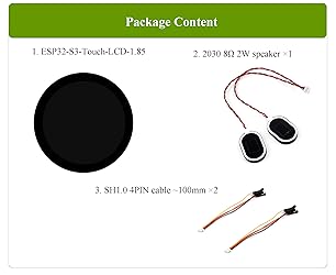 - Features 1. ESP32-S3-Touch-LCD-1.85 (with Touch function version) is a microcontroller development board with 2.4GHz W-iF-i and Blue-too-th BLE 5 support, integrates high-capacity Flash and PSRAM. Onboard 1.85inch LCD display which can smoothly run GUI programs such as LVGL 2. Combined with various peripheral interfaces, suitable for the quick development of the HMI and other ESP32-S3 applications. 3. Equipped with high-performance Xtensa 32-bit LX7 dual-core processor, up to 240MHz main frequency. 4. Supports 2.4GHz W-i-F-i (802.11 b/g/n) and Blue-too-th 5 (LE), with onboard antenna. Built-in 512KB S RAM and 384KB ROM, with onboard 16MB Flash and 8MB P S RAM. 5. Onboard 1.85inch Touch Screen , 360×360 resolution, 262K color. IPS Display Panel, 262K color, 360×360 resolution, wide viewing angle. Adapting UART, I2C and some IO interfaces. 6. Onboard audio decoder, Microphone, QMI8658 6-axis sensor, RTC sensor, TF card slot and battery recharge management module, etc. Supports accurate control such as flexible clock and multiple power modes to realize low power consumption in different scenarios. Comes with Online Tutorial Usage Guide and Online Development Resource, Please check: n9.cl/dq5ww1 Package Content ESP32-S3-Touch-LCD-1.85 x1 2030 8Ω 2W speaker ×1 SH1.0 4PIN cable ~100mm ×2