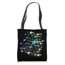 Python is a high-level programming language with a design philosophy that emphasizes code readability. This network graph shows languages connected with Python through influence relations, i.e. languages that were influenced by or influenced Python. More influential languages are shown as larger circles as compared to languages with less influence on others. The influence relation data was retrieved from public domain data sources in 2022. A great gift for programmers who are into digital art. 16” x 16” bag with two 14” long and 1” wide black cotton webbing strap handles. Made of a lightweight, spun polyester canvas-like fabric. All seams and stress points are double-stitched for durability, and the reinforced bottom flattens to fit more items and hold larger objects. Spot clean/dry clean only.