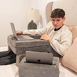 - Experience Ultimate Comfort and Versatility with Our Multi-Functional Reading Pillow Redefine relaxation and productivity with this versatile reading and gaming pillow, thoughtfully designed to meet your every need—whether you're working, gaming, reading, or crafting. With its luxurious materials and practical features, it’s more than just a pillow; it’s your go-to companion for comfort and support. This extra-large arm rest pillow for adults provides unrivaled comfort during long hours of use. Its ergonomic design, complete with supportive armrests and a widened desktop, makes it perfect as a laptop pillow lap desk for bed or a knitting pillow for lap support. The pillow contours to your body, offering superb support while alleviating fatigue, whether you’re gaming on the couch or reading in bed. Adding to its functionality,a separate coaster pillow enhances the experience by serving as an iPad stand, cup holder, or game controller support. From binge-watching shows to attending virtual meetings, this lap pillow adapts seamlessly to your lifestyle. The spacious leg groove ensures freedom of movement, transforming it into an excellent lap pillow for gaming, crafting, or studying. Crafted with care, this memory foam bed rest pillow is upholstered in soft grey velvet chenille fabric that is both machine washable and stylish. The high-density memory foam core provides the ideal balance of comfort and resilience, making it a durable choice for everyday use. Certified to Oeko-Tex Standard 100, it guarantees safety for all ages. Whether you’re using it as a reading pillow for gaming, a crocheting pillow, or a soft lap desk pillow for adults, its thoughtful design ensures unmatched versatility. Compact Packing is a breeze with the included reusable vacuum-sealing bag, making this lap pillow a space-saving solution for smaller rooms or travel. Elevate your gaming experience with a pillow that does it all—a perfect gift for gamers or anyone seeking comfort and convenience in their everyday activities. A perfect gift for back to school! This is a dream come true for remote learning and college dorms. The student in your life will love to be able to relax in bed while studying, typing their assignments, remotely listening to their lecture and reading their textbooks.
