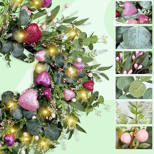 - Romantic Design & Size -- Adorn your front door or wall with our 25-inch Valentine's Day wreath, featuring a romantic blend of pink and red glitter hearts, eucalyptus leaves, and soft LED lights. Perfect for creating a warm and inviting atmosphere.