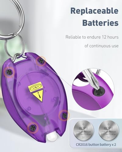- Replaceable Batteries: Each keychain flashlight is equipped with 2 CR2016 Lithium button cells. Each battery withstands 12 hours of continuous use. Replace the batteries by opening the shell from the bottom with a screwdriver