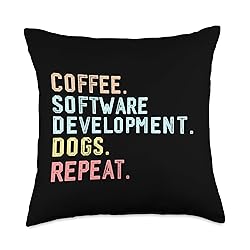 100% Polyester Software Development Coffee Dog design for husband, wife, dad, or mom on birthday, anniversary, or party. 100% spun-polyester fabric Double-sided print Filled with 100% polyester and sewn closed Individually cut and sewn by hand Spot clean/dry clean only
