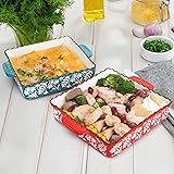 Package Includes: The package contains two ceramic baking dishes in blue and red color, each dish measures 9''L x 9''W x 2.3''H, very suitable for preparing and serving various dishes. Ceramic Material: The porcelain square bakeware is made of high-quality ceramic, withstand high temperatures without cracking or breaking, and it is safe to use in dishwasher, microwave, freezer and oven. Convenient Double Handle: Each lasagna pan is equipped with double handles, making it easier to hold or carry from the oven to the countertop or from the kitchen to the dining table. Easy to Clean: The smooth surface makes the dish non-stick and easy to clean, simply hand wash them or place them in the dishwasher, without worrying about breakage and glaze wear. Multiple Uses: Perfect for cooking and sharing gratin, roasted meat, lasagna, casseroles, brownies, desserts, and more. Whether you're preparing a family dinner or serving, this versatile baking dish has got you covered.