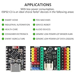 - Overview of Functions:1. ESP32-C3 is a MCU system-level chip(SoC) with very low power consumption and high integration, integrating 2.4Ghz Wi-Fi and low-power Bluetooth(Bluttooth) dual-mode wireless communication.2. ESP32-C3 is equipped with RISC-V 32-bit single-core processor, with a four-level pipeline architecture, with a main frequency of up to 160MHz.3. ESP32-C3 has built-in 400KB SRAM and 384KB ROM storage space.4. ESP32-C3 is the industry's leading integrated Wi-Fi+Bluetooth LE solution5.Powerful CPU: ESP32-C3, 32-bit RISC-V single-core processor, running up to 160 MHz6.WiFi: 802.11b/g/n protocol, 2.4GhHz, support Station mode, SoftAP mode, SoftAP+ Station mode, hybrid mode7.Bluetooth: Bluetooth 5.08.Ultra-low power consumption: deep sleep power consumption of about 43μA9.Rich board resources: 400KB SRAM, 384KB ROM built-in 4Mflash.10.Chip model: ESP32C3FN411.UItra-small size: As small as the thumb (22 52x18mm) classic shape, suitable for wearables and small projects12.Reliable security features: Encryption hardware accelerators that support AES-128/256, hashing, RSA, HMAC,digital signatures, and secure startup13.Rich interface: 1xI2C, 1xSPI, 2xUART, 1 1xGPIO(PWM), 4xADC14.Single- sided components, surface mount design15.Onboard LED blue light: GPIO8 pin16.Support Software Development:-C/C++/ESP-IDF-VSCODE/MICROPHYTHONApplication Scenarios1. Second development of monitoring, video, photography and other Aolt applications.2. Wireless communication solutionsPackage:3pcs ESP32-C3 Development Board ESP32 Mini WiFi Bluetooth3PCS Expand board