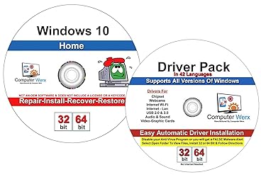 Computer Werx Compatible with Windows Replacement for 10 Home 32/64 Bit DVD install recovery restore & repair DVD plus Drivers Pack