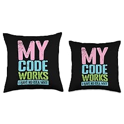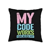 100% Polyester Beautiful motif on the topic programming. Associated terms are computer, coding and software. Nice grafic for Computer Fans and Internet Nerds with the title: My Code Works, I Have No Idea Why. The language of computers consists of 1 and 0, not everyone can tell the PC what to do. It is not easy to program the so called software, for that you have to be almost a nerd. Games or software have programmed databases. 100% spun-polyester fabric Double-sided print Filled with 100% polyester and sewn closed Individually cut and sewn by hand Spot clean/dry clean only