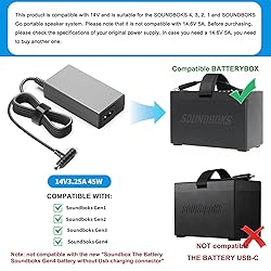 • Charger Power Supply Cord Adapter Specification Input: 100-240V 50-60Hz Output:14V 3.3A DC Charging Cable Length:1.8m/5.91ft + AC Power Cable : 1.2m/3.94ft Compatible with models Soundboks Gen 1 Bluetooth Performance Speaker Soundboks Gen 2 Bluetooth Performance Speaker Soundboks Gen 3 Bluetooth Performance Speaker Compatible with Soundboks Battery Keyu KA4802A-1403300P KA4802A1403300P Package Content 1*Soundboks Power Cord Charger 1*US Power Cable 1*User Manual