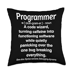 Our Funny Programmer design is perfect for programmers who enjoy adding humor to their work, celebrating the challenges and quirks of coding life with a playful twist. This design makes a great gift for software developers, coders, and tech enthusiasts, ideal for wearing during coding sessions, developer meetups, or just for sharing laughs in the tech industry. 100% spun-polyester fabric Double-sided print Filled with 100% polyester and sewn closed Individually cut and sewn by hand Spot clean/dry clean only