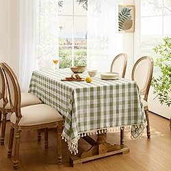 CLASSIC GINGHAM TABLECLOTH WITH TASSELS: Featuring the timeless spring easter green and white buffalo check pattern with playful tassel fringe, this tablecloth blends rustic, farmhouse charm and modern elegance to create a cozy, inviting dining atmosphere. PREMIUM FABRIC AND CRAFTSMANSHIP: Made from soft, luxurious linen cotton, this plaid tablecloth is non-slip, wrinkle-resistant, and highly durable. It effectively protects your table while offering a beautiful drape for an elegant and polished look. BEST SPRING DECOR: This green and white checked tablecloth with tassels is perfect for both everyday use and special occasions. It can be used indoors in the kitchen, dining room, or living room, or outdoors for weddings, spring parties, picnics, and barbecues. A great gift to enhance any space. SIZE CHOICES: Each package includes 1 table cloth for 6 foot rectangle tables measuring 55" W by 84" L. The tablecloth is typically larger than your table size, so it's recommended to add at least 20 inches to the length of your table (10 inches on each side) for a better drape effect. EASY TO CARE: Machine washable or wipe clean with a damp cloth. Made from medium-weight, durable cotton-linen, this tablecloth is fade-resistant, shrink-resistant, wrinkle-free, and pill-free. The tassels remain intact even after washing.Note: The material tag on this tablecloth incorrectly says "100% Polyester. It is actually a polyester-cotton blend.