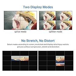 Yinker 2x2 HDMI Video Wall Controller is for 1 HDMI input and 4 HDMI HD outputs. It's for displaying 1 source integrally into 4 splicing screens through splicing and amplifying technique. 180° Rotation: This Video Wall Processor can flipping into 180 degress rotation, no need to worry about the cable connection and modes changing. Easily control the screens with the remote control. 1 in 4 out HDMI Video Wall supports 8 splicing modes: 1X1,1X2,1X3,1X4,2X1,2X2,3X1,4X1. Plug and play, driver-free. 4K Video Wall Controller Support max 4K@60Hz & HDMI 2.0 & HDCP 2.2, downwards compatible with 7680x1080@60Hz, 5760x1080, 1920x3240, 1920x2160, 1920x4320. Simple and handy switching by panel buttons and IR remote controller. Allows conveniently switching from long distances. (Battery is not included inside the remote by security issue)