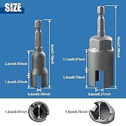 Size: 12mm: inner diameter is 12mm, slotted depth is 12mm, slotted width is 4mm; 19mm: inner diameter is 19mm, slotted depth is 19mm, slotted width is 8mm. Material: Made of chrome vanadium steel, hard and wear-resistant; sandblasted surface, not easy to rust.easy to use,1/4 inch hex handle for use with a power drill. Simply insert it into the drill chuck to install wing nuts/blinds without worrying about spraining your thumb with other hardware tools, reducing finger wear. Slotted Design: Upgraded slotted design allows wing nut sockets to simultaneously tighten or loosen hex screws, panel wing nuts, screw eyes, C-hooks and Q-hooks. Extended design: Compared to the 12mm slotted socket, the slotted depth is deeper and wider, and the deeper opening is suitable for most screws. Wide range of uses: Suitable for home DIY, auto parts, woodworking, gardening, professional machine repair and so on.