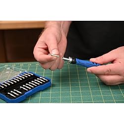 Driver features a quick turn end cap which allows the driver to spin quickly while downward pressure is being applied to the fastener Driver has 3 ratcheting settings; loosen, tighten and locked Ergonomic comfort-grip handle reduces hand fatigue Includes: Phillips:#000, #00(2), #0(2), #1, Slotted:1/16 in, 3/32 in, 1/8 in, 5/32 in, Star: T5(2), T6, T7, T8, T9, T10(2), Pz:#0, #1, Hex:1/16 in, 3/32 in, 1/8 in, 5/32 in Great for everyday tasks and DIY and home improvements