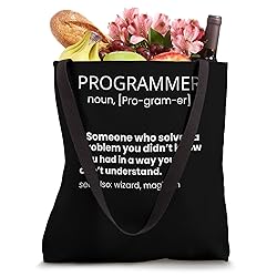 Grab this Best Programmer Definition Art for your programmer nerd dad, mom, husband, brother, friend or relative! It's the perfect geek gift idea & present for birthday, father's day And mother's day! 16” x 16” bag with two 14” long and 1” wide black cotton webbing strap handles. Made of a lightweight, spun polyester canvas-like fabric. All seams and stress points are double-stitched for durability, and the reinforced bottom flattens to fit more items and hold larger objects. Spot clean/dry clean only.