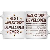 - Best Javascript Developer Ever 11oz White Ceramic Mug: Monizilucky creates unique funny coffee mugs which make great Birthday gift ideas for men, Birthday gift ideas for women, Valentine’s Day gift ideas, Mother’s Day gift ideas for Mom from Daughter or Son, Father’s Day gift ideas for Dad, Anniversary gift and Christmas present ideas for him or her. This funny coffee mug is made out of high quality ceramic. If you're shopping for a gift, you've found the one. Have a great gift delivered to their door, on-time in a nice gift box. This is the perfect mug for you or for someone you want to bring a smile to. A perfect size mug you can drink tea, soup or coffee out of. ● Printed in the USA ● Worldwide shipping ● Print type: Sublimation printing ● Material: Ceramic ● Color: White ● Sizing: 11oz ● Printed on both sides.