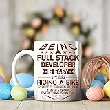 - Being a Full Stack Developer Is Easy 11oz White Ceramic Mug: Monizilucky creates unique funny coffee mugs which make great Birthday gift ideas for men, Birthday gift ideas for women, Valentine’s Day gift ideas, Mother’s Day gift ideas for Mom from Daughter or Son, Father’s Day gift ideas for Dad, Anniversary gift and Christmas present ideas for him or her. This funny coffee mug is made out of high quality ceramic. If you're shopping for a gift, you've found the one. Have a great gift delivered to their door, on-time in a nice gift box. This is the perfect mug for you or for someone you want to bring a smile to. A perfect size mug you can drink tea, soup or coffee out of. ● Printed in the USA ● Worldwide shipping ● Print type: Sublimation printing ● Material: Ceramic ● Color: White ● Sizing: 11oz ● Printed on both sides.