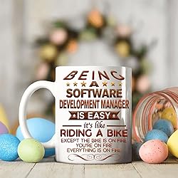 - Being a Software Development Manager Is Easy 11oz White Ceramic Mug: Monizilucky creates unique funny coffee mugs which make great Birthday gift ideas for men, Birthday gift ideas for women, Valentine’s Day gift ideas, Mother’s Day gift ideas for Mom from Daughter or Son, Father’s Day gift ideas for Dad, Anniversary gift and Christmas present ideas for him or her. This funny coffee mug is made out of high quality ceramic. If you're shopping for a gift, you've found the one. Have a great gift delivered to their door, on-time in a nice gift box. This is the perfect mug for you or for someone you want to bring a smile to. A perfect size mug you can drink tea, soup or coffee out of. ● Printed in the USA ● Worldwide shipping ● Print type: Sublimation printing ● Material: Ceramic ● Color: White ● Sizing: 11oz ● Printed on both sides.