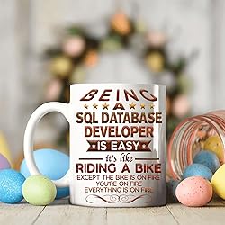 - Being a Sql Database Developer Is Easy 11oz White Ceramic Mug: Monizilucky creates unique funny coffee mugs which make great Birthday gift ideas for men, Birthday gift ideas for women, Valentine’s Day gift ideas, Mother’s Day gift ideas for Mom from Daughter or Son, Father’s Day gift ideas for Dad, Anniversary gift and Christmas present ideas for him or her. This funny coffee mug is made out of high quality ceramic. If you're shopping for a gift, you've found the one. Have a great gift delivered to their door, on-time in a nice gift box. This is the perfect mug for you or for someone you want to bring a smile to. A perfect size mug you can drink tea, soup or coffee out of. ● Printed in the USA ● Worldwide shipping ● Print type: Sublimation printing ● Material: Ceramic ● Color: White ● Sizing: 11oz ● Printed on both sides.