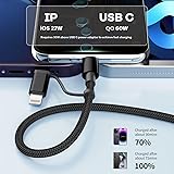 - xperience Ultimate Charging Versatility: The Travel 2-in-1 Fast USB-C Charging Cable! Say goodbye to cable clutter! The 2-in-1 USB-C Charging Cable features a unique interchangeable design. Simply switch between the included lightning port and Type-C tip to instantly transform it from a powerful USB-C to USB-C cable (max 60W fast charging) to a USB-C to Lightning cable (max 27W fast charging). Engineered with premium Thickened Tinned Copper Wires, this usb c multi charging cable ensures superior conductivity and efficient power delivery. Built to endure daily demands, it has been rigorously tested to withstand over 20,000 bends and plug/unplug cycles, guaranteeing exceptional durability and long-lasting reliability. Beyond just power, this dual usb c lightning cable 2 in 1 is your smart companion. Both the USB-C and Lightning connectors support high-speed data sync (up to 480Mbps), making it fully compatible with CarPlay and Android Auto. Seamlessly charge your device while navigating or streaming music in your vehicle. Enjoy remarkable wide compatibility. This versatile multi-charging cable works flawlessly with virtually all Type-C and Lightning port devices. Simplify your charging setup with one usbc charging cable that truly does it all – offering speed, safety, durability, data sync, and universal compatibility.