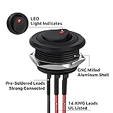 Robust Aluminum Housing: This round rocker switch shell is made of full aluminum and comes copper nut for. The premium material made switch ensures safety, durable and long-lasting than plastic ones 20A Current Rated Switch: This SPST switch comes with UL listed 14 AWG wire leads for 12V or 24V circuit on/off switching, supports Max 240 watts power totally, 20A@12VDC 10A@24VDC Handy Pre-Soldered Leads: The SPST switch lead wires are soldered onto the terminals with joints covered neatly by shrink wrap. Saves connection works and ensures a long-lasting solid connection Red Lighted Led Indicator: This 12V toggle switch red LED light indicates the on/off status of power. It lights up when switch was turned on, keep off when switch was turned off 1” (25mm) Mounting Hole: The on/off switch installation is simple, drilling a 1" (25mm) hole on the mounting surface and easily secure the switch with offered nut, very sturdy and shock-proof Universal Applications: The round 12V rocker switch is widely applied to automotive, race cars, RVs, marine, heavy duty trucks, off road vehicles, ATVs, and nearly everything that uses a 12V power source.
