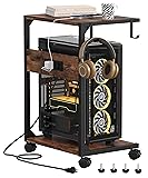 Akxomel 2 Tier Computer Tower Stand with Charging Station, 11.8" D x 16.5" W Rolling Floor PC Tower Stand Fits Under Desk, CPU Holder Cart for Carpet with Hooks, C Shaped End Table for Home Office
