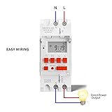 EXTEND YOUR APPLIANCES LIFE: Programmable timer switch support 8 ON or OFF programs per day, practical to use, extend the life of your appliances and your home AUTOMATICALLY TURN ON AND OFF: The programmable timer outlet can automatically turns on and off lamps and other electrical devices, save your time and costs on electricity ACCURATE AND PROGRAMMABLE: Timer switch support 24 hours 7 days a week programmable. Repeat programs with 8 on off settings, and setting on off manually. Reasonable and accurate designs LCD DISPLAY: Timer switch with countdown function. LCD display with LED indicators, easy to read. Suitable for 35mm DIN rail mounted, maximum 24 hours countdown to OFF USING TIPS: If you use digital timer with large capacity battery(included), you can save the programs you set for back up memory when power failure, and to use