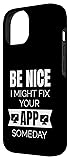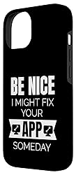- Showcase your passion for programming with this cool design. Whether you're debugging code, crafting the new big app, or just having a laugh with your fellow developers, this statement is sure to resonate: Be nice, I might fix your app someday. Perfect gift idea for Software engineers, coding professionals and Hackathon participants. This design combines clever wordplay with a modern, minimalist aesthetic, making it a must-have for anyone in the tech community