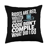 For Coders, IT, Computer Tech, Programming Nerds and Geeks who loves humor. This "Roses are red, Violets are blue, Code didn’t compile, What did I do" poem is perfect for you. Show your humor with this poetry literature design. Ideal for Coders, Software Developers who loves humor. This Literary inspired design featuring a funny poem is perfect ideal for you. Showcase your passion in programming with this Funny Coding Software Dev Humor & Programmer Poems. 100% spun-polyester fabric Double-sided print Filled with 100% polyester and sewn closed Individually cut and sewn by hand Spot clean/dry clean only