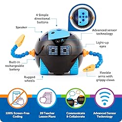 SCREEN-FREE CODING - Introduce your child to programming basics without screen time using Cooper's built-in programming buttons, perfect for kids who need a break from digital devices MULTIPLE INTERACTIVE MODES - Engage children with black line tracking, light sensing, object detection, and robot-to-robot communication features that keep playtime fresh and educational RECHARGEABLE CONVENIENCE - Save money and reduce waste with the included USB-C charging cable—no batteries required—providing hours of uninterrupted learning and play on a single charge. COMPREHENSIVE KIT - Everything needed to start coding right away, including 20 lesson plan cards, 40 coding cards, a ball accessory, quick start guide DEVELOPS CRITICAL THINKING - Enhance problem-solving abilities as children experiment with programming sequences, helping them build logical reasoning skills suitable for ages 5 and up.