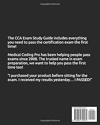 - BONUS EXTRAS! #1 Medical Coding Prep Course eBook download ($97 Value) with over 400 pages of instruction. #2 CCA Exam Study Guide eBook ($47 Value). #3 Mastering ICD-10-CM eBook ($47 Value). #4 Mastering CPT Coding eBook ($47 Value). #5 Mastering HCPCS Level II eBook ($47 Value). #6 Mastering Modifiers eBook ($47 Value). Get REAL practice exam questions that look like the questions you will encounter on the actual certification exam, with detailed answers and rationale. Stop wasting your time with outdated codes and unrealistic exam questions. Make your study time count! The CCA Exam Study Guide 2025-2026 Book includes:115 question practice exam with answers & rationaleOver 180 Exclusive "Real World" Bonus Medical Coding Tips & TricksCommon AnatomyMedical TerminologySecrets to Reducing Exam StressScoring Sheets The Medical Coding Exam Prep Course BONUS eBook includes:Over 400 pages of medical coding exam instruction700 mock exam questions with answers & rationale1,200 medical terms definedClinical explanationsEverything from Coding Concepts to Surgical Op ReportsAlso Included: Mastering ICD-10-CM BONUS eBookIntroduction to ICD-10-CMStructure of ICD-10-CMCoding GuidelinesChapter-Specific GuidelinesCommon Coding PracticesDiagnostic Coding and its ImpactCase StudiesFuture of ICD Coding Mastering CPT Coding BONUS eBook:Introduction to CPT and the CPC ExamAnatomy of the CPT CodeNavigating the CPT CodebookEvaluation and Management (E/M) ServicesSurgical ProceduresRadiology Coding Pathology and Laboratory CodingMedicine CodingAnalyzing Case StudiesExam Preparation StrategiesFinal Review and TipsContinuing Education and Career Advancement Mastering HCPCS Level II BONUS eBookIntroduction to HCPCS Level II CodingMastering HCPCS Level IICoding for Durable Medical EquipmentAdvanced Billing and Reimbursement StrategiesHCPCS Level II Compliance and AuditingTelehealth Services and HCPCS Level II CodingUnderstanding Modifiers in HCPCS Level IITraining and Certification for HCPCS Level II CodersCase Studies and Practical Applications Resources for HCPCS Level II Coders Mastering Modifiers BONUS eBookIntroduction to Medical CodingUnderstanding ModifiersCommonly Used ModifiersGuidelines for Using ModifiersModifier Scenarios and Case StudiesAdvanced Modifier ConceptsResources and Tools for MasteryPractice and Assessment Everything is designed for students preparing for the Certified Coding Associate certification exam from AHIMA after January 1, 2025. All codes are current for 2025. ***** Look at what some students had to say after using our practice exams *****Very Helpful. I passed the CPC first time I took it. 🙌🏽 NaKisha WAwesome Book! I used this to study for the exam… passed first try! Zach UExcellent Upgrade With All The Coding Tips! A lot for the price! Amazon CustomerGreat to Study off of. Gives you a good idea of what the test is like. April J.I just wanted to let you know I MADE A 92!” - Heather T.”Great practice test… I passed the AAPC test the first try!” - Natalia”Great guide. Helped me pass the exam the first time!” - Dianne L.“Your test was amazing, it help me out a lot.” - Vickey L.