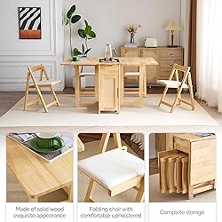 • The VINGLI Folding Dining Table Set is a versatile and space-saving solution for your kitchen or dining area. This 5-piece set includes a solid wood extendable drop-leaf table, 4 chairs, and 2 convenient drawers for extra storage. Designed with wheels for easy mobility, this table can be effortlessly folded and adjusted to fit your space. With a natural wood finish, it combines functionality and elegance, perfect for small kitchens or apartments that need a practical, stylish dining option.