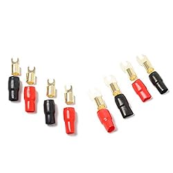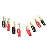 - insulated crimping fork terminal connector, electrical contact Power cord/ground wire fork terminal. banana plug replacement. It is safer than connecting bare wires. After high-quality copper heat test, gold plating prevents corrosion. make sure increased power flow and highest quality For Audio without distortion. Specifications: Name: Brass terminal Colour:Gold + red + black Material:Brass + insulated PVC Size: 2.4cm Package includes: 10* Red terminal 10* black terminal Only the above package content, other products are not included. Note: Light shooting and different displays may cause the color of the item in the picture a little different from the real thing. The measurement allowed error is +/- 1-3cm.