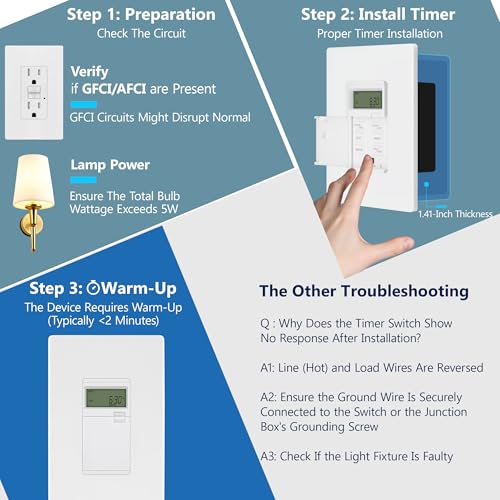- Reliable Performance & Electrical Specifications — This timer switch operates at 120V, 60Hz with a capacity of 15A resistive, 1200W tungsten, 1200W ballast, and 1/2 HP motor. No neutral wire required, ground wire required for easy installation. 2 minutes warm up required after installation. UL Listed.