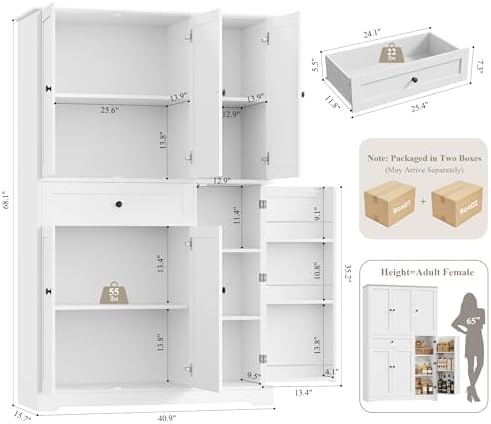 HOSTACK 68" Tall Kitchen Pantry Storage Cabinet, Modern Kitchen Hutch Cabinet with Doors and Shelves, Freestanding Food Pantry with Large Storage Drawer for Dining Room, Living Room, White