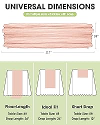 100% Polyester UNIVERSAL DIMENSIONS: Measuring 35"×117", this cheesecloth table runner is ideally sized to fit standard 6-8ft tables, offering suitable coverage with just the right amount of drape. The 12" to 24" drop on both ends adds a graceful touch that enhances the overall presentation of your table. SUPERIOR MATERIAL: This table runner is made from premium cheese cloth, feeling soft and comfortable to the touch. Its unique wrinkles create a handcrafted look that adds a charming, vintage vibe to your table. With its breathable texture and beautiful drape, it brings a rustic yet elegant touch to any setting. PREMIUM CRAFTSMANSHIP: Pureegg table runner is meticulously crafted with a tightly woven design, ensuring it maintains its shape and durability over time. Carefully stitched edges resist fraying and unraveling, allowing the table runner to stay in excellent condition even after repeated use. WASHABLE & REUSABLE: Designed to last, this cheesecloth table runner keeps its shape even after washing. For gentle maintenance, simply hand wash in cold water and lay flat to dry in a shaded area. Avoid using bleach and ironing to keep it in excellent condition for repeated use. VERSATILE DECORATION: Available in a variety of colors, this versatile table runner is perfect for wedding party, baby shower, bridal party, Valentine's Day, Easter, Thanksgiving, Christmas, New Year's Day, tea party, anniversary, holiday and other special events.