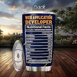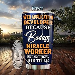 - Honor the Web Application Developer in your life with this sleek 20oz Stainless Steel Tumbler! Whether they’re working, or enjoying a well-deserved break, this insulated coffee mug is the perfect companion. Made from premium stainless steel, it keeps drinks hot for over 6 hours or cold for 12+ hours – ideal for the office, travel, or home.Designed with a 20oz capacity, this tumbler fits seamlessly into car cup holders and busy schedules alike. The double-wall construction ensures no sweat on the outside, while the spill-resistant lid keeps every sip mess-free.Looking for a thoughtful gift? This tumbler shines as a retirement present, birthday surprise, Christmas treat, or appreciation token for men and women in communications.It is the perfect choice for any occasion, whether you are drinking coffee, tea, or water. ● Print type: UV printing. ● Material: Stainless steel. ● Sizing: 20oz curved. ● Free second side printing. ● Hand wash only with water and mild detergents. ● Can not be used in the dishwasher. ● Vibrant color reproduction. ● Lightweight and long-lasting. ● Printed in the USA. ● Worldwide shipping.