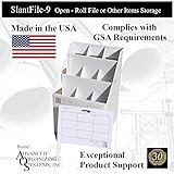MADE IN THE USA: Responsive USA Customer Support. GSA Compliant. IDEAL STORAGE SOLUTION: Designed by an Architect to organize and store rolled documents and items such as plans, maps, posters, wrapping paper, or other items. Ideal for permanent or active storage in office, home, classroom, or jobsite. DURABLE AND ATTRACTIVE: Exceptional strength from double layered interior partitions. Reinforced bottom proven to prevent breakthroughs. Side handles and stylish design with subtle gray lettering on sturdy white corrugated cardboard. ORGANIZED LABELING: Labeled on Interior & Exterior. “Document Locator” Card for effective organization is stored in the SlantFile. This filing convention (especially using a spreadsheet or database program) has proven to provide quick and easy document retrieval. ORGANIZED COMPARTMENTS: 9 individual compartments to organize documents @ 5.25”x5.25”. Outside file dimension is 16.5”x16.5”x26”.