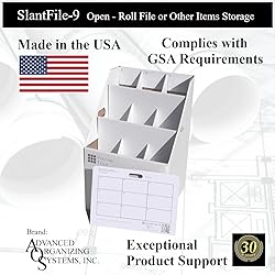 - SlantFile-9-- For active use rolled documents or other items of various lengths. By Advanced Organizing Systems, Inc. The economical solution to organize plans, maps, graphics, and other objects in office and home. Attractive and durable corrugated cardboard with reinforced bottom. Gray lettering on white background. Side handles with “Document Locator” card for easy labeling is stored in the SlantFile. 9 compartments @ 5.25"x5.25". Overall size is 16.5”x16.5”x26”. MADE IN USA, USA Customer Support.